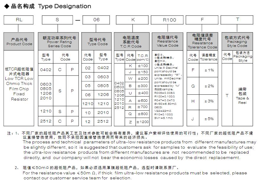 風華低TCR超低阻厚膜片式固定電阻型號表示方法: