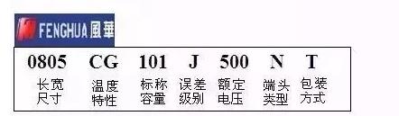 例如:風(fēng)華貼片電容型號: 0805CG101J500NT