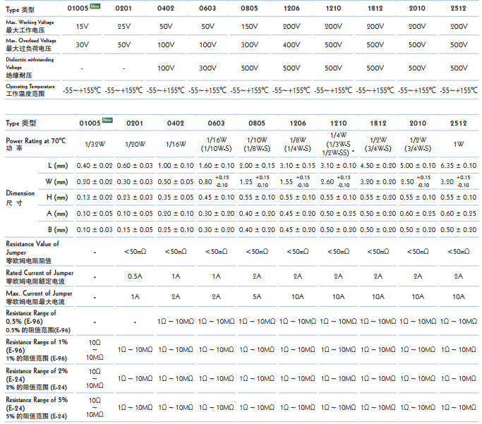 產(chǎn)品封裝:01005/0201/0 603/0805/1206/1210/2010/2512...