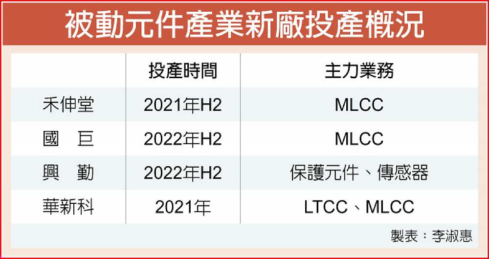 被動元件廠 砸250億擴產,為了迎接5G、車用的需求,2021~2022年間至少有四座被動元件新廠投入量產,其中禾伸堂(3026)2021年下半年龍潭新廠可望率先試投,由于電動車需求將在2025年進入主升段,紅色供應鏈沒有合格的產能之下,臺、日被動元件廠將成受惠者。 合計國巨(2327)、禾伸堂、興勤(2428)、華新科(2492)等四家廠商,投入新廠的資金超過250億元,光